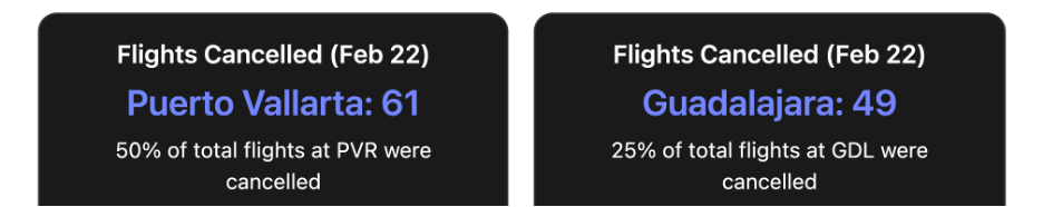 | Puerto Vallarta (Jalisco) | Urban roadblocks and unrest were also reported in Puerto Vallarta. Armed groups set buses on fire in the city center and temporarily impeded highways (e.g. Libramiento Luis Donaldo Colosio). Local public transit was suspended for several hours, and road travel was hazardous, though this primarily impacts local distribution rather than long-haul freight. | Puerto Vallarta Int’l Airport (PVR) effectively shut down on Feb 22: 100% of flights were cancelled or rerouted that day29. (By 6:30 PM, 50% of scheduled flights – 61 flights – were confirmed cancelled30, with all remaining flights subsequently grounded.) - Several inbound flights to PVR were diverted to alternate airports31 32. Airlines (e.g. Air Canada, United) temporarily suspended services to PVR amid the turmoil |