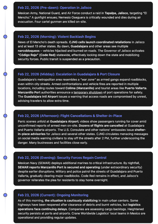 On February 22, 2026, a major federal security operation in Jalisco, Mexico (near Tapalpa) resulted in the death of cartel leader Nemesio “El Mencho” Oseguera, the notorious head of the Jalisco New Generation Cartel (CJNG). In the immediate aftermath, widespread violent reprisals erupted across parts of western Mexico. Armed groups carried out coordinated attacks, including roadblocks (narcobloqueos), vehicle burnings, and armed assaults in at least 14 states. The violence was concentrated in Jalisco – notably in the Guadalajara metropolitan area and Puerto Vallarta – and also affected neighboring Colima (Manzanillo) and other states (Michoacán, Guanajuato, Tamaulipas, Aguascalientes, and more). These incidents have serious implications for freight and logistics operations in the region.